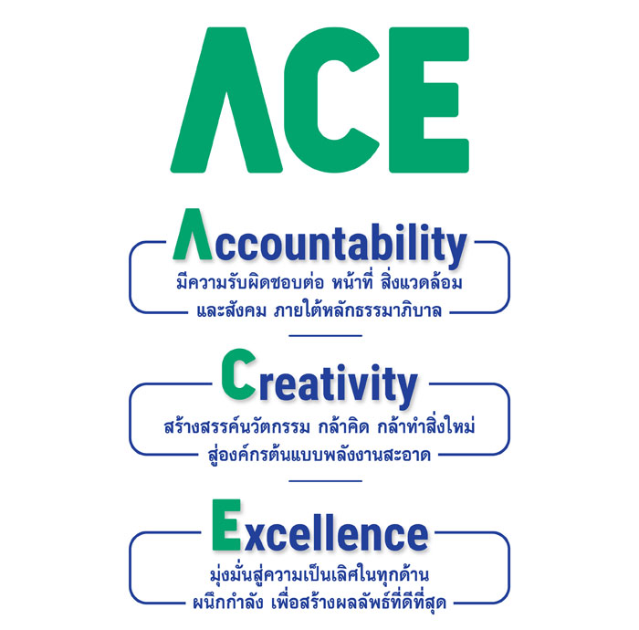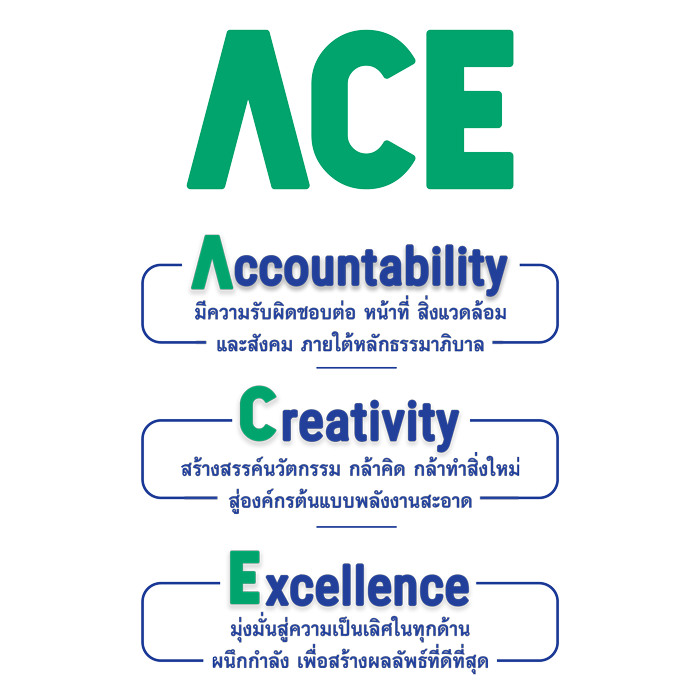 ACE has a strong background in the clean energy power plant business, with more than 40 years of experience and high expertise in technology for generating electricity from biomass fuels, solid waste fuel, natural gas fuel and solar power. We also invent in research and development innovative in clean energy power plants that are friendly to the environment, society and communities which can increase production efficiency and cost effectiveness in various management as well as create research developments on fast growing plants and energy crops to encourage farmer network to plant and sell as fuel back to our power plants. Under the vision of being a world leading clean and sustainable power producer, that is responsible for environment, society, and shareholders under good governance, as well as being one of the world's leading power plant operators who develop the most efficient power generation technology system, coupled with a focus on building stability and sustainable business prosperity, improving the quality of life of farmers and communities surrounding the power plant as well as being a part of building the country's energy security.