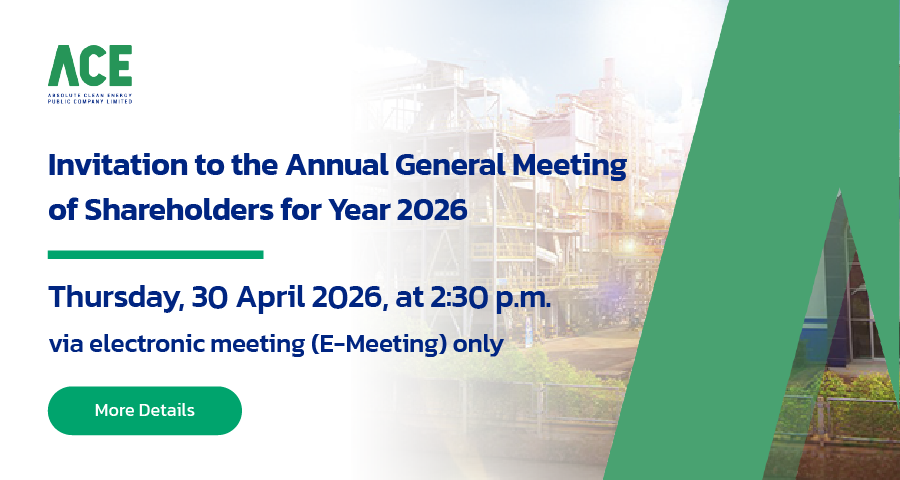 Absolute Clean Energy Public Company Limited (“ACE”) is one of the country's largest producer and distributor of electricity from renewable energy and being the clean energy leader in Thailand. Its main business is holding shares in other companies (Holding Company) that generate and distribute electricity and steam including other related businesses both in Thailand and other countries.