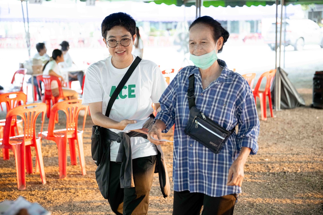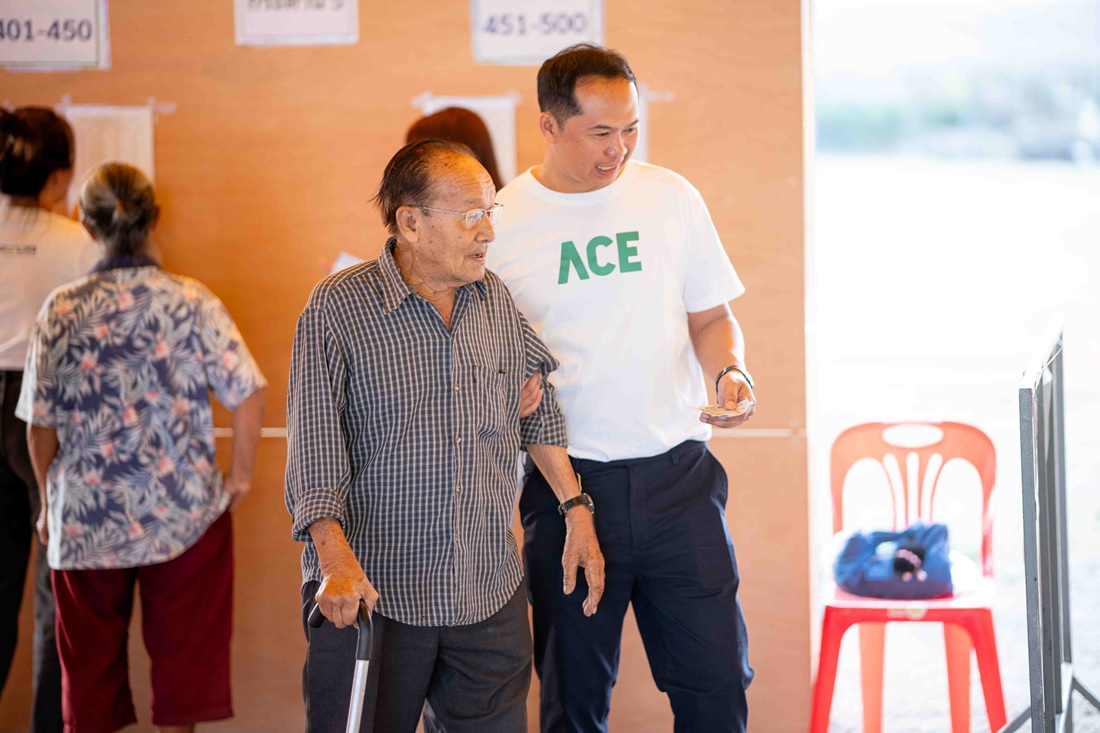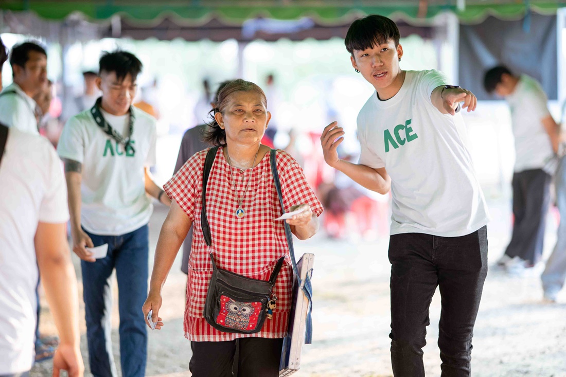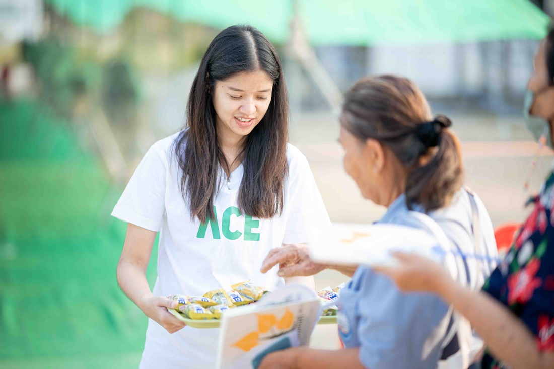 ในนามของ ACE คุณจิรฐา คุณธีรวุฒิ คุณณัฏฐ์ และคุณพรเมตต์ ดำเนินชาญวนิชย์ ร่วมให้การต้อนรับและส่งมอบถุงยังชีพแก่ประชาชนกว่า 1,000 คน ครอบคลุมผู้สูงอายุ กลุ่มเปราะบาง พระสงฆ์ สามเณร ครู และผู้นำชุมชนในพื้นที่
